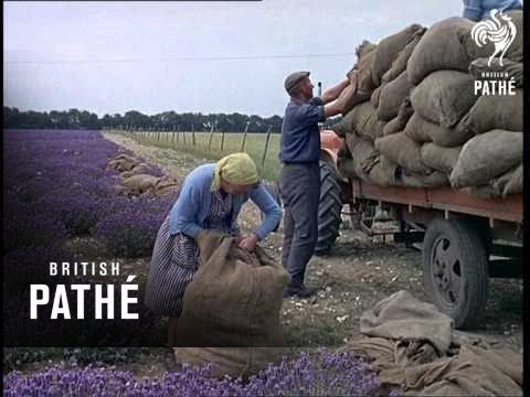 Lavender Farm (1962) - Lavender Angustifolia Little Lady - Heacham Lavender Farm, Norfolk. C/U shot of face of a man smelling a bright violet lavender flower. M/S of another man picking the flower and smelling it.